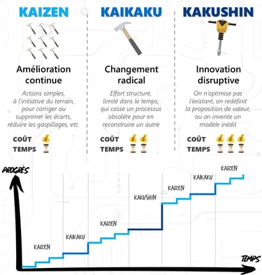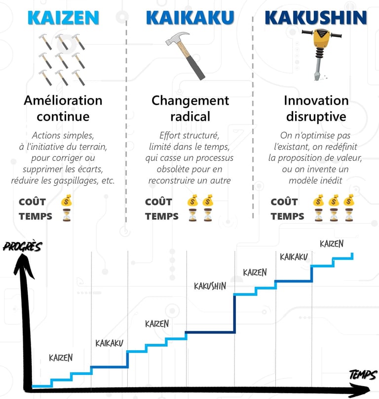 Kaizen, Kaikaku, Kakushin : trois niveaux d’amélioration continue, du petit pas au saut stratégique. Découvrez comment les combiner efficacement.